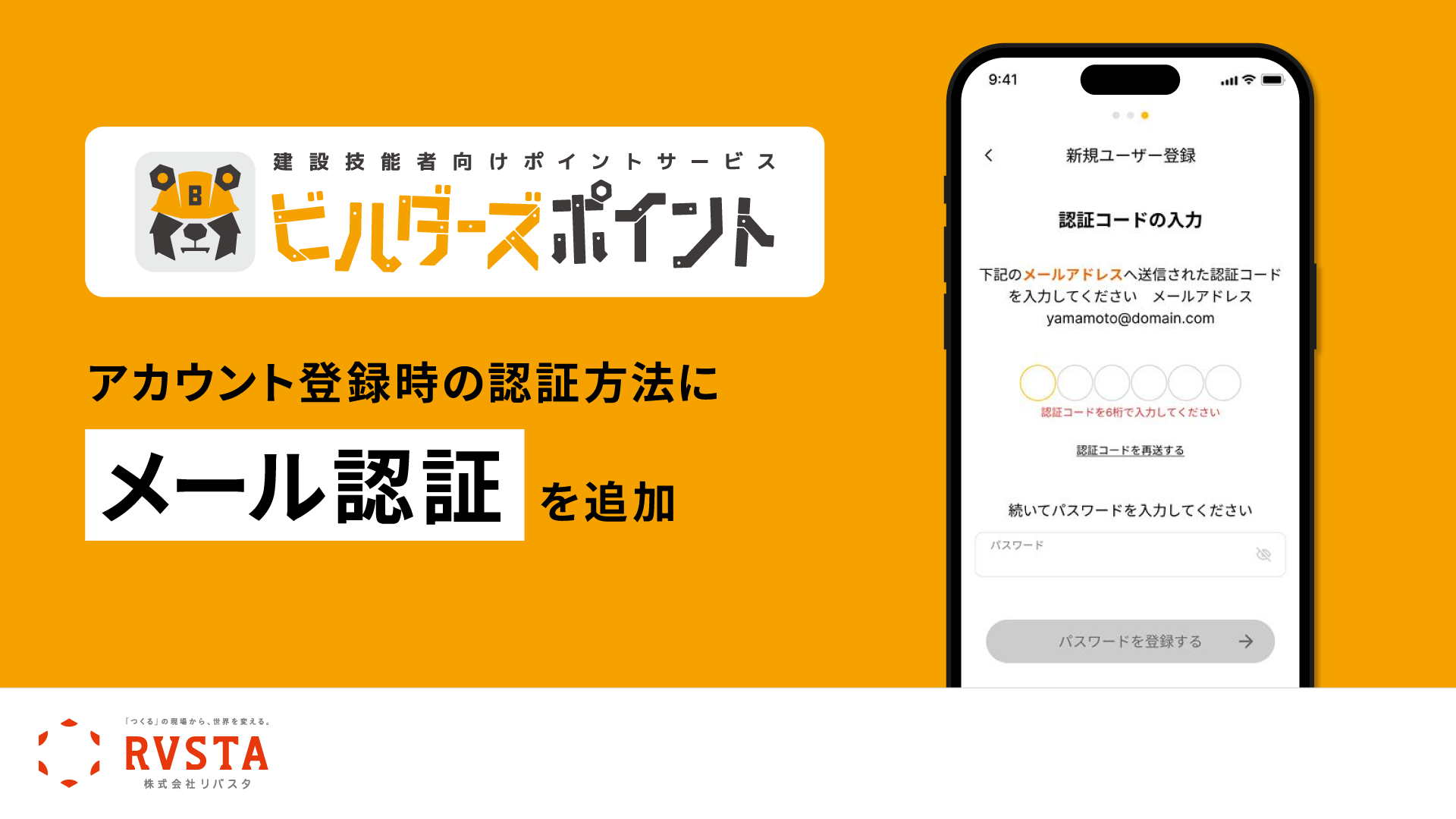 株式会社リバスタ(本社:東京都江東区、代表取締役:高橋巧、以下 当社)は、当社が提供する建設技能者向けポイントサービス「ビルダーズポイント」において、アカウント登録時の本人確認方法に、従来の SMS(※1)認証に加え、メール認証を新たに追加しました。これにより、建設技能者(以下 技能者)のスマートフォンが SMS を受信できない場合でも、「ビルダーズポイント」へのアカウント登録が可能になり、元請会社から受け取ったポイントを Amazonギフトカードに交換(※2)して利用することができます。