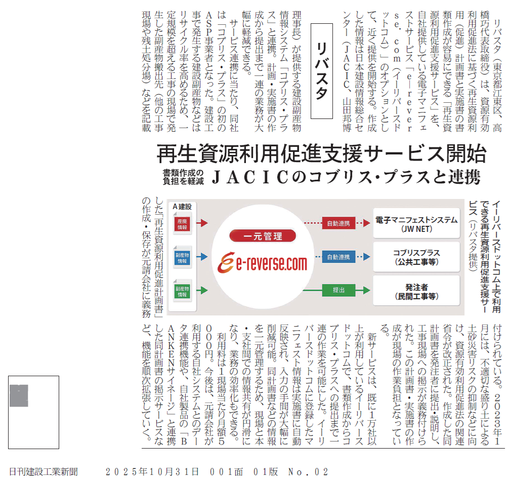 当社が2025年11月4日より提供を開始した電子マニフェストサービス「e-reverse.com」のオプションである「再生資源利用促進支援サービス」について、日刊建設工業新聞にご掲載いただきました。